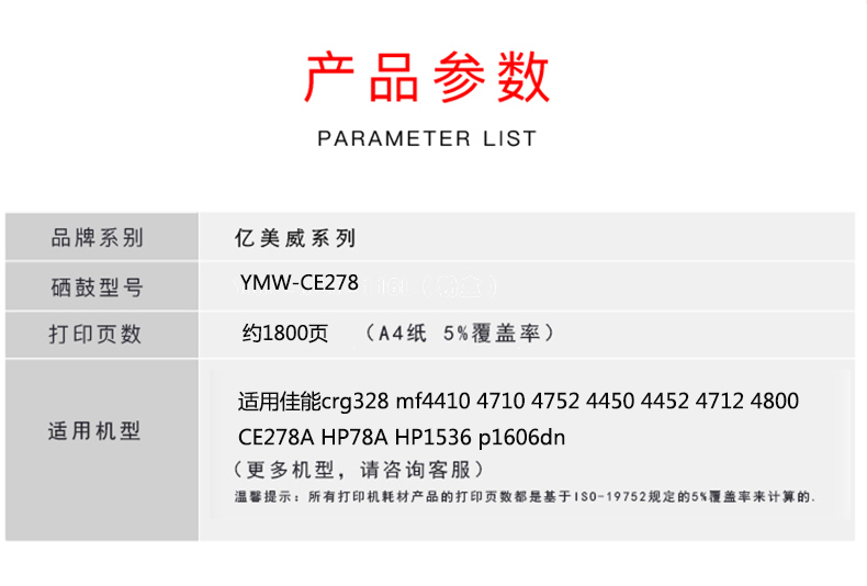億美威 YMW-CE278 惠普 LaserJet Pro P1566/1606/1536 全國(guó)統(tǒng)一價(jià):178元